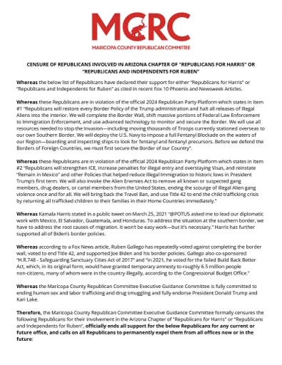 This week the Maricopa County Republican Committee (MCRC) issued an announcement “censured” 40 community leaders many of who are not Republicans. Imagine a meat packers union censuring its vegetarian members. Complete nonsense.
